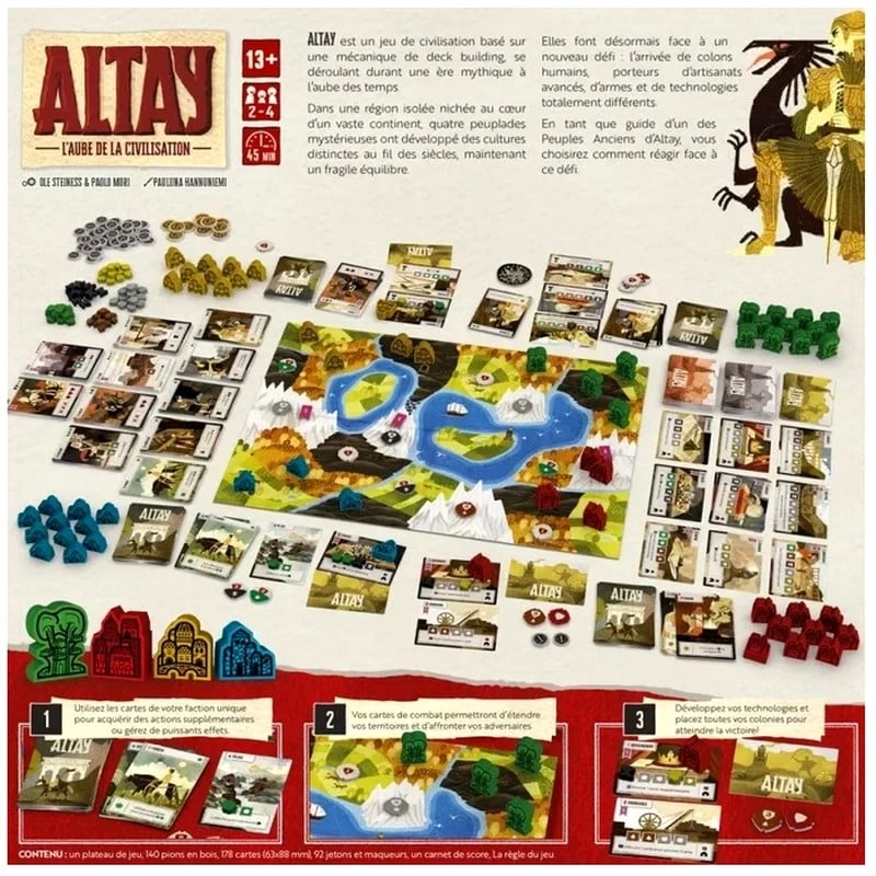 Altay – L’Aube de la Civilisation est un mélange original de deck-building, de développement de civilisations et d’expansion de zones. Les joueurs contrôlent l’une des quatre factions, chacune représentée par un deck de départ avec des cartes uniques et des différences subtiles dans le nombre de cartes « de base ». À chaque tour, les joueurs utilisent leurs cartes pour produire des ressources (pierre, métal, bois, connaissances), construire de nouvelles colonies et s’étendre sur le plateau, attaquer ou se défendre contre leurs ennemis, ou encore manipuler leur jeu ou leur main de cartes.