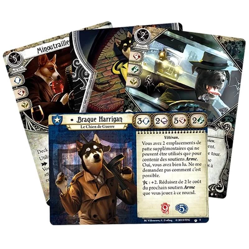 Retrouvez le monde d’Horreur à Arkham : le Jeu de Cartes sauf que vous incarnez des personnages de chiens humanoïdes dans les rues de Warkham.