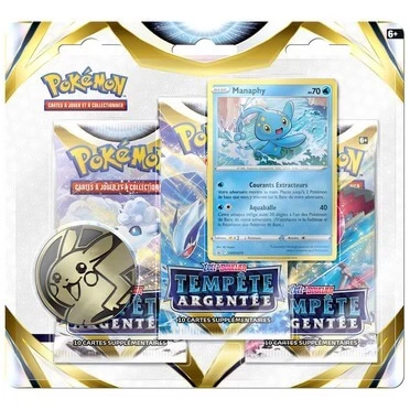 Pack contenant 3 Boosters Pokémon VF de la série EB12 Tempête Argentée, ainsi qu’une carte promo Manaphy et une pièce.