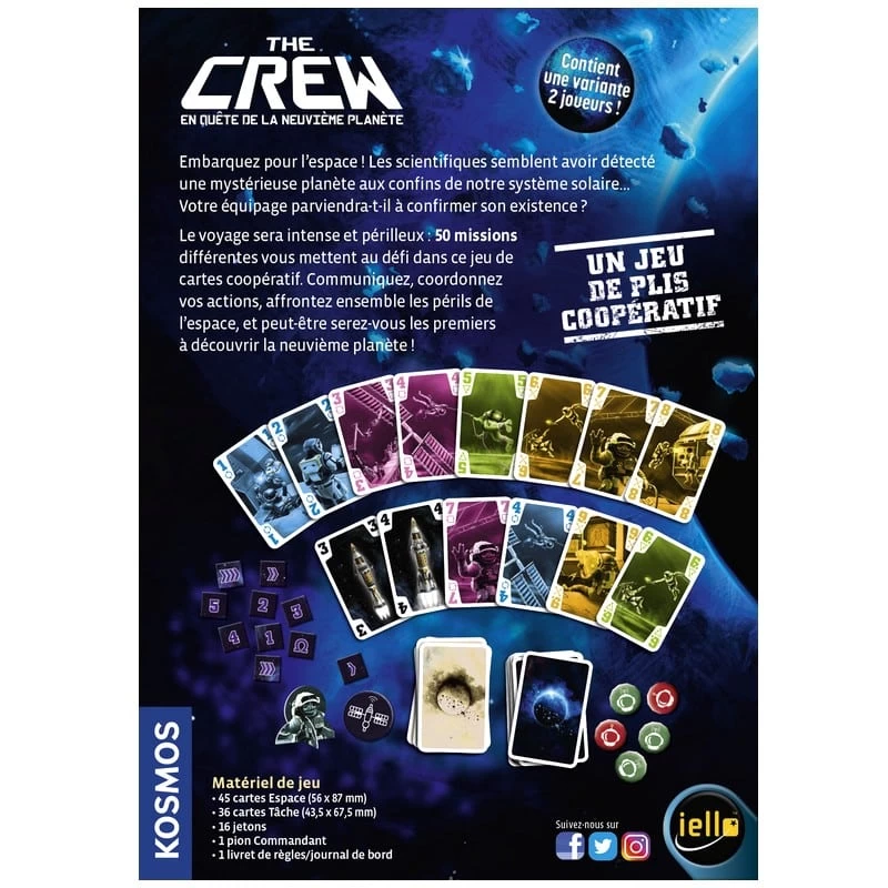 Dans The Crew, les joueurs incarnent les membres d’un équipage spatial en voyage vers une mystérieuse planète. Mais le périple s’annonce épique, car il faudra accomplir 50 missions de plus en plus périlleuses avant de pouvoir atteindre la destination. Pour remporter une mission dans The Crew, chaque joueur doit accomplir les tâches qui lui sont assignées. A chaque tour de jeu, les joueurs jouent une unique carte de leur main pour former un pli. Le joueur qui veut accomplir sa tâche doit non seulement remporter le pli, mais aussi s’assurer que la carte correspondant à la tâche soit présente dans le pli !