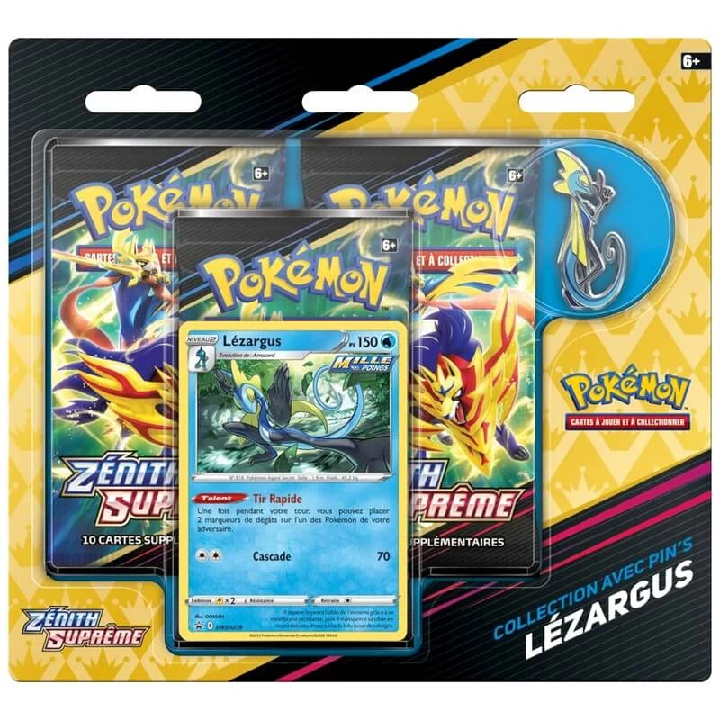 Pack contenant 3 boosters EB12.5 : Epée & Bouclier Zénith Suprême, 1 carte promo Lézargus, 1 pin’s Lézargus.