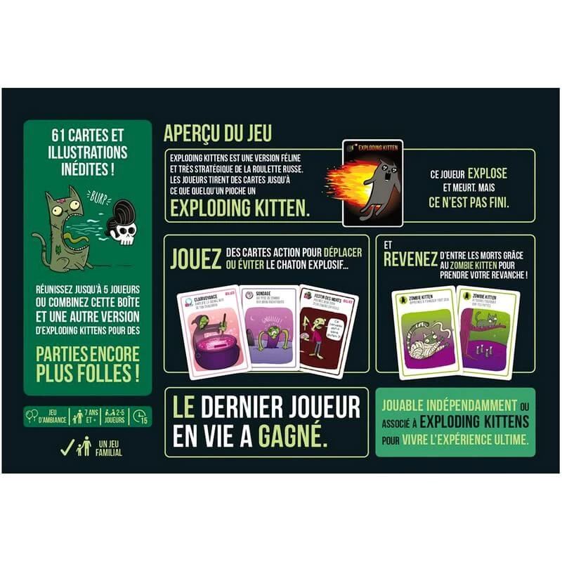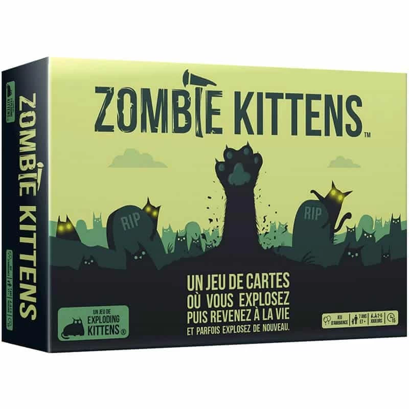 Désormais, si vous tirez un chaton explosif et disposez d’un chaton zombie, remettez la carte mortelle dans la pioche, continuez à jouer, et ramenez un autre joueur d’entre les morts !